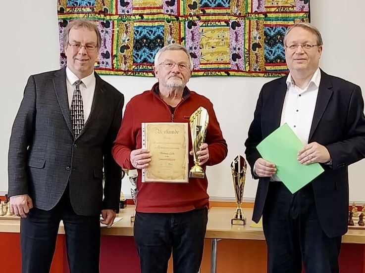 Der Husumer Thomas Lehr (Mitte) wird für seinen dritten Platz bei den Senioren der LEM SH geehrt vom Präsidenten des Schachverbandes SH Dirk Martens (links) und dem Turnierleiter Heiko Spaan (rechts)