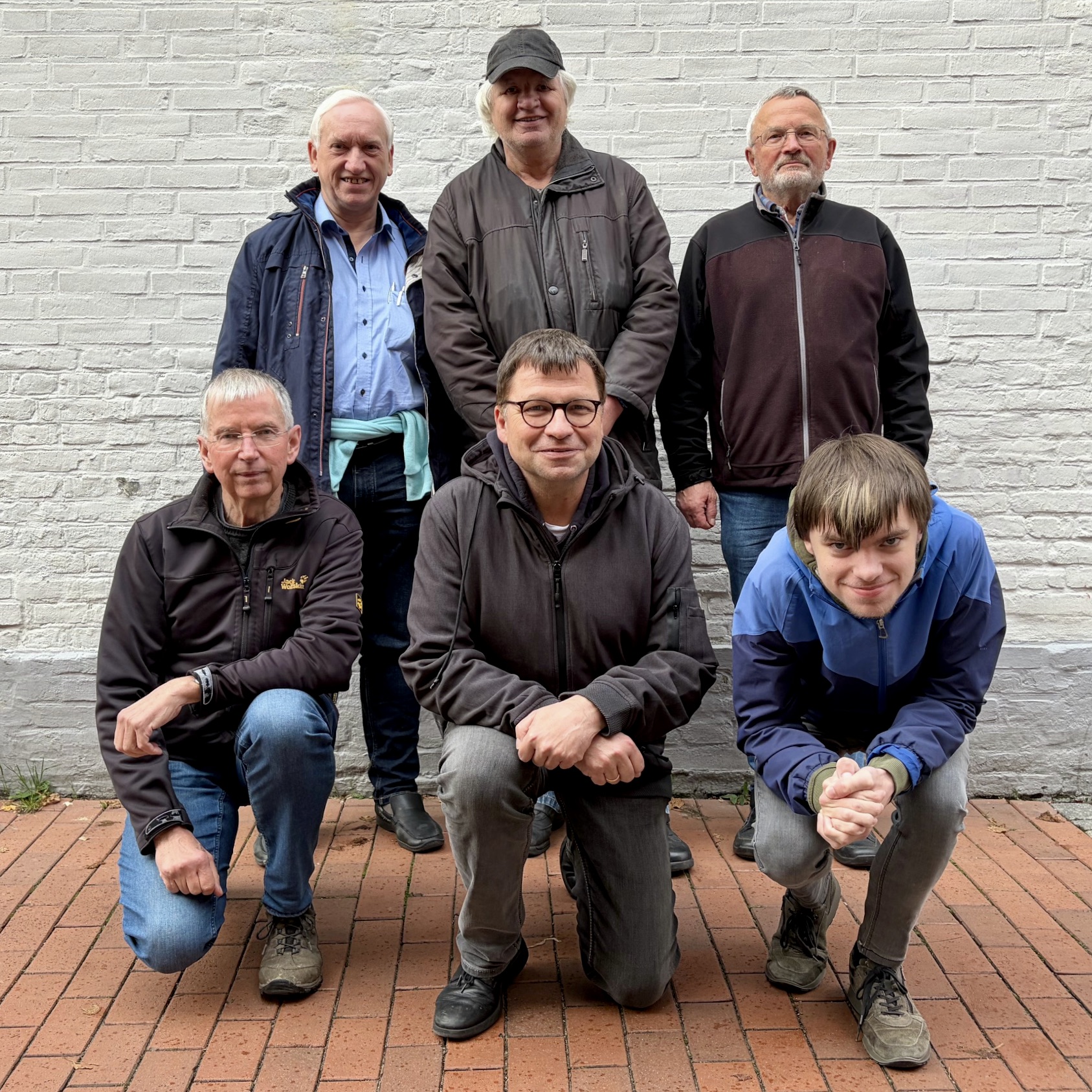 Die zweite Mannschaft des Husumer Schachvereins stehend (von links): Gregor Raupach, Uwe Jacobsen und Thomas Lehr, kniend (von links) Holger Ohst, Christoph Preuß und Richard Preuß. (Foto: Lothar Meyer)
